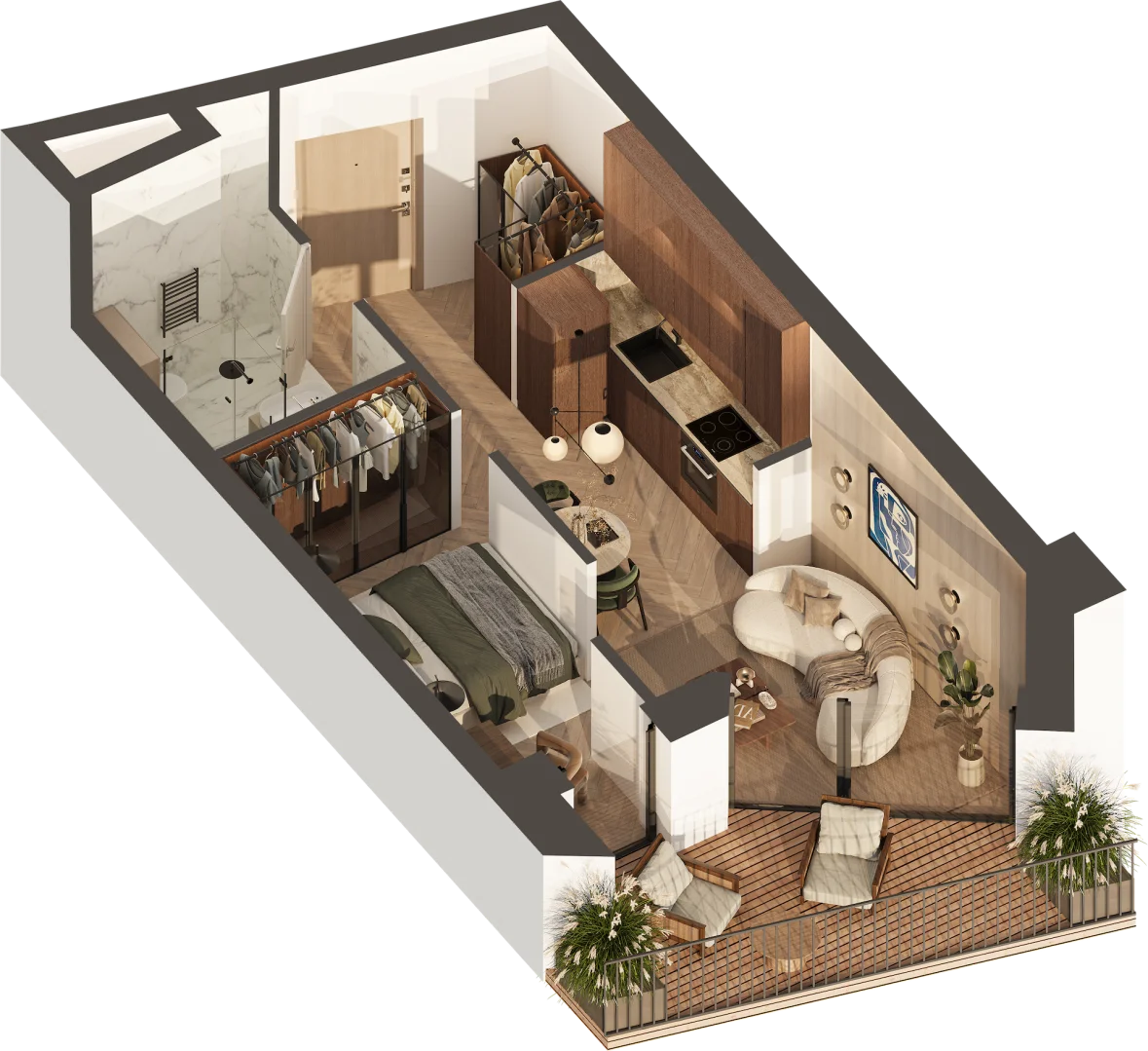 Rafinuota architektūra, modernūs apartamentai su balkonais ir terasomis, stilingos laiptinės, žaliuojantys kiemai, kokybiški sprendimai ir apgalvotos lauko erdvės poilsiui bei žaidimams kuria idealaus būsto pajūryje portretą poilsiui, šeimai ar investicijai.