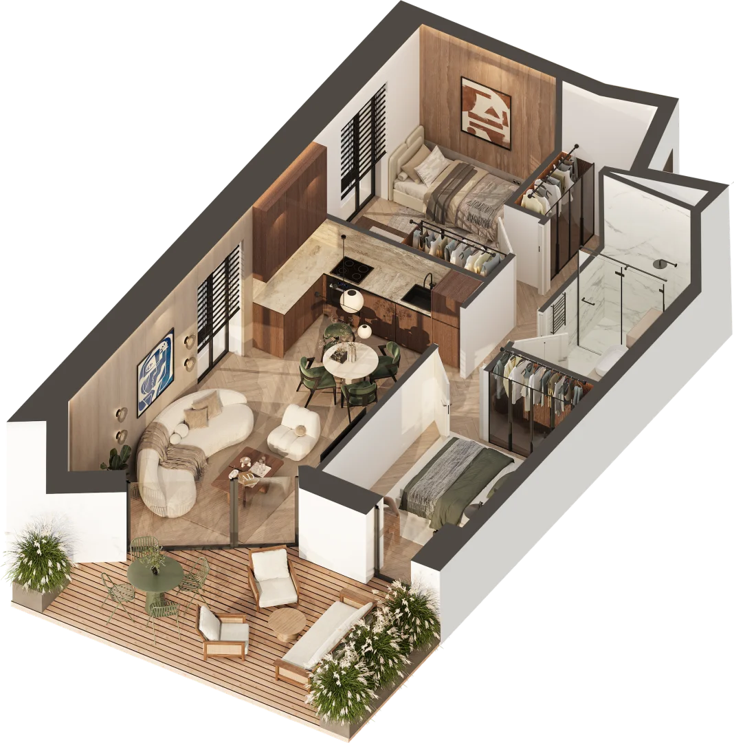 Rafinuota architektūra, modernūs apartamentai su balkonais ir terasomis, stilingos laiptinės, žaliuojantys kiemai, kokybiški sprendimai ir apgalvotos lauko erdvės poilsiui bei žaidimams kuria idealaus būsto pajūryje portretą poilsiui, šeimai ar investicijai.